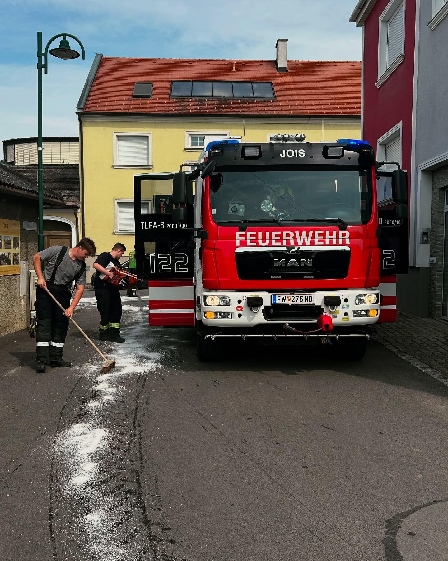 Eine ca. 3 km lange Ölspur zog sich durch das Ortsgebiet von Jois und in weiterer Folge entlang des Radweges Richtung Neusiedl/See. Die Ölspur wurde mittels Ölbindemittel gebunden und die Verkehrswege somit wieder gesäubert. Nach 2,5 Stunden konnten wir wieder ins Feuerwehrhaus einrücken.